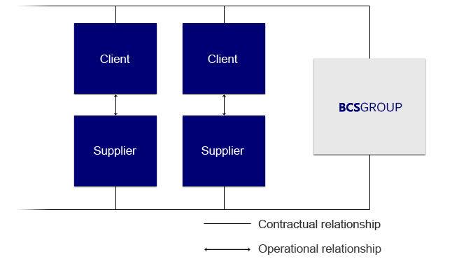 BCS negotiates on the basis of the group purchase volume (the volume of all the customers) and acts as a contractual intermediary between its customers and its suppliers. Any operational relation (order, invoice, payment) proceeds directly between the customers and the suppliers.